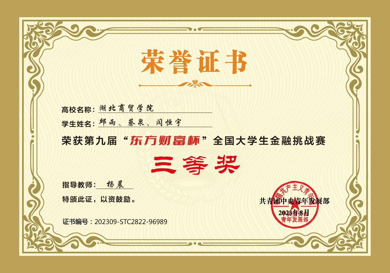 由共青团中央青年发展部主办,全国学校共青团研究中心、东方财富信息股份有限公司承办的2023年“东方财富杯”全国大学生金融素养提升活动——第九届“东方财富杯”全国大学生金融挑战赛已成功落下帷幕。经济学院1支团队荣获国家三等奖、2支团队荣获省级一等奖、1支团队荣获省级二等奖。