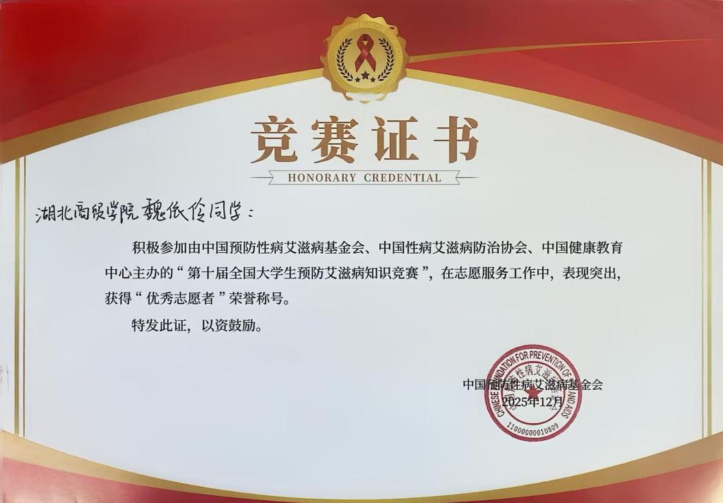 此次竞赛由中国预防性病艾滋病基金会、中国性病艾滋病防治协会、中国健康教育中心联合主办,旨在向广大青年学生普及艾滋病防治知识,提升自我保护意识与社会责任感。通过线上线下相结合的方式,积极开展防艾宣传,组织主题宣讲、推送科普内容,累计发动数百名师生参与竞赛答题与防艾知识学习,高效的组织工作让其成功摘得“优秀组织单位”称号。
