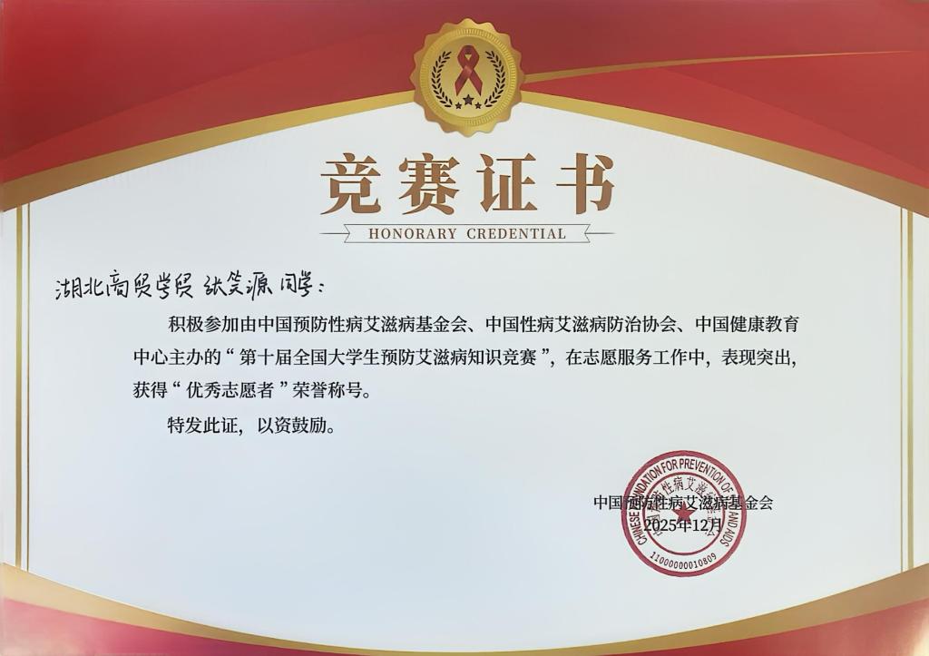 近日,湖北商贸学院经济与管理学院“求实”志愿者服务队在“第十届全国大学生预防艾滋病知识竞赛”中荣获多项集体与个人荣誉,团队获评“优秀组织单位”,多名队员分别获“优秀组织者”“优秀志愿者”及社会实践相关表彰,展现出学院学子扎实的专业素养和昂扬的志愿服务精神。