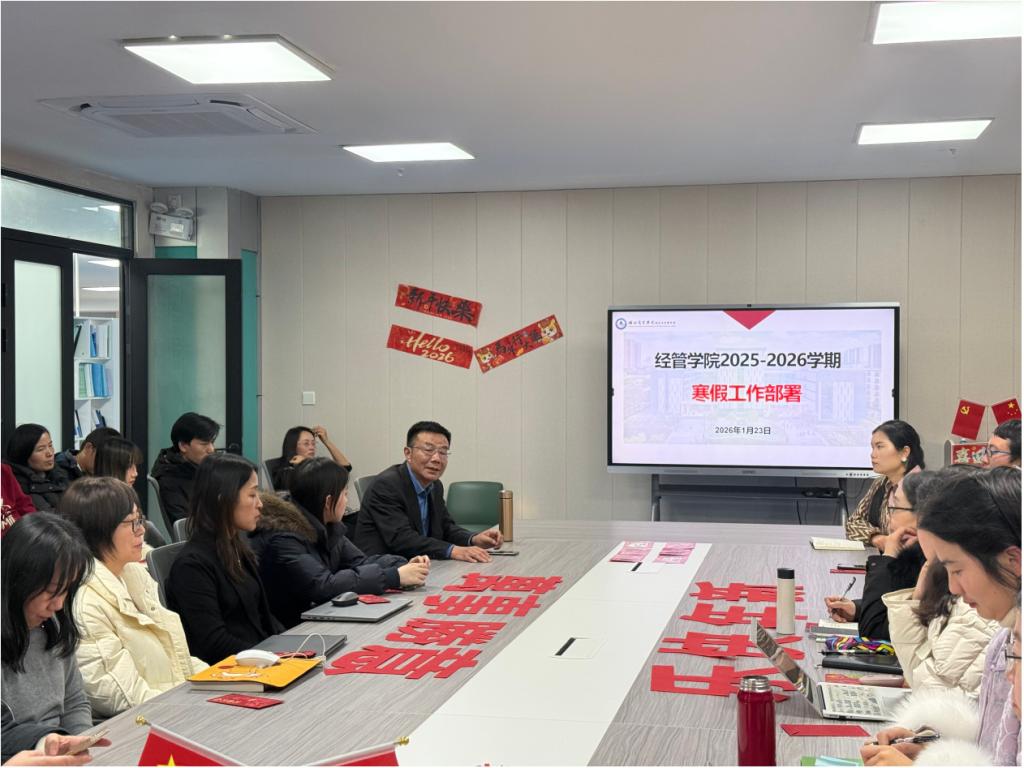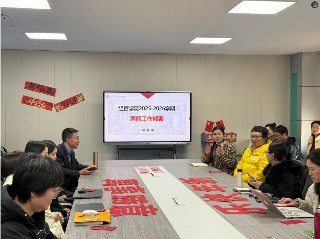 为统筹推进寒假期间各项工作,确保育人链条不断档、事业发展不停步,1月22日、1月23日,经济与管理学院在学院会议室分别开展2026届毕业论文撰写质量专题会议及2025-2026学年寒假工作部署会。会议由副院长孟静主持,全体教师参会。