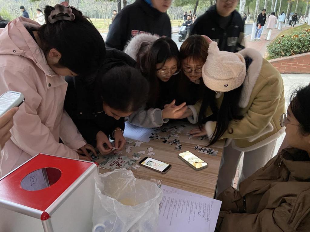 本次活动摒弃单一的宣讲模式,创新采用拼图比拼与公祭日知识问答相结合的形式,将历史知识与互动体验深度融合。拼图环节中,同学们凝神聚力,将碎片化的历史图景逐步还原,每一块拼图的归位,都是对历史细节的一次重温;知识问答环节里,从南京大屠杀的历史节点到国家公祭日的设立意义,从抗战时期的英雄事迹到和平年代的青年使命,一个个问题引发全场思考,同学们积极抢答,在问答中厘清历史真相,筑牢历史记忆。